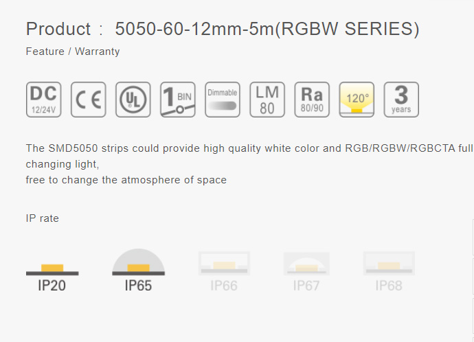 Brief introduction: SMD 5050 Strips could provide high quality white color and RGB/RGBW/RGBCTA full changing light,free to change the atmosphere of space.