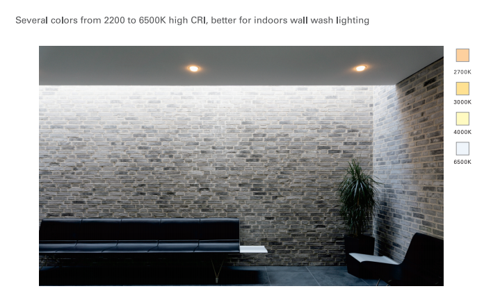 Several colors from 2200 to 6500K high CRI,better for indoors wall wash lighting.